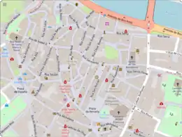 La partie médiévale de la ville fut fortifiée jusqu'au XIXe siècle, lorsque la ville fut choisie chef-lieu de la province de Pontevedra en 1833. Compte tenu des besoins d'expansion de la ville en raison de ses nouvelles fonctions de chef-lieu, les remparts furent démolis. Au cours des 25 dernières années du XIXe siècle, qui coïncident avec l'étape de la Restauration bourbonienne en Espagne, des projets importants ont été entrepris pour établir le modèle de ville bourgeoise, avec des travaux d'infrastructure et de nouveaux sièges administratifs, l'ouverture des rues et les premiers pas de la zone d'expansion de la ville, la place du quai et le nouveau marché. Au milieu de ces actions, les Tours Archiépiescopales uniques en leur genre, furent démolies. Parallèlement, l'expansion de la ville en dehors des anciens remparts a commencé à prendre de l'ampleur. Le nouveau réseau de rues a commencé avec le tracé de la rue Oliva en 1851 et de la rue Michelena en 1854[72], qui relie la Plaza de la Peregrina et la Plaza de España en suivant l'ancien tracé des remparts. Les nouvelles rues de la Paja (rue Alameda) et de la Gran Vía (Gran Vía de Montero Ríos), tracées respectivement en 1881 et 1893, partent de cette dernière place.