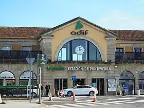 Quant au transport ferroviaire RENFE est le principal opérateur ferroviaire. Dans la ville, il y a la Gare de Pontevedra, une gare ferroviaire, appelée en espagnol Estación de Pontevedra-Vialia dans le secteur sud de la ville, appartenant au réseau Adif dans laquelle se trouve le centre commercial Vialia. Il y a aussi un arrêt, la gare de Pontevedra-Universidad (en espagnol Estación de Pontevedra-Universidad), situé au nord de la ville, qui dessert ce secteur ainsi que le Campus de Pontevedra. La gare de Pontevedra, d'où part un embranchement ferroviaire vers le port de Marín-Pontevedra, fonctionne comme une liaison ferroviaire vers le port. La gare centrale de passagers, au sud de la capitale a été récemment remodelée et rénovée pour accueillir le train à grande vitesse AVE.