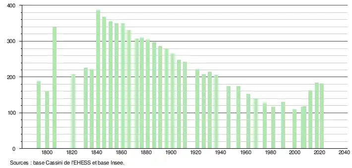 L'évolution du nombre d'habitants est connue à travers les recensements de la population effectués dans la commune depuis 1793. Pour les communes de moins de 10 000 habitants, une enquête de recensement portant sur toute la population est réalisée tous les cinq ans, les populations légales des années intermédiaires étant quant à elles estimées par interpolation ou extrapolation[45]. Pour la commune, le premier recensement exhaustif entrant dans le cadre du nouveau dispositif a été réalisé en 2007[46].