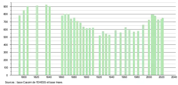 L'évolution du nombre d'habitants est connue à travers les recensements de la population effectués dans la commune depuis 1793. Pour les communes de moins de 10 000 habitants, une enquête de recensement portant sur toute la population est réalisée tous les cinq ans, les populations légales des années intermédiaires étant quant à elles estimées par interpolation ou extrapolation[24]. Pour la commune, le premier recensement exhaustif entrant dans le cadre du nouveau dispositif a été réalisé en 2004[25].