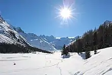 Les glaciers à proximité comprennent le glacier Morteratsch et le glacier Roseg. Celui de Morteratsch a une remontée mécanique et une longue descente le long du glacier ; c'est un pilier économique de la ville[6]. Le val Roseg a une piste de ski de fond damée sur toute sa longueur.