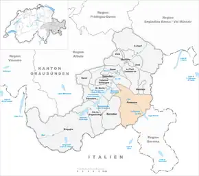 Avant 2017, la municipalité était située dans le sous-district d'Oberengadin du district de Maloja. Depuis 2017, elle fait partie de la région de Maloja[5] Elle se trouve dans le Val Bernina, qui est la vallée la plus élevée qui bifurque vers la vallée de la Haute-Engadine. La commune comprend la plus haute montagne du canton, le Piz Bernina (4 049 m) avec le glacier de Pers, à la frontière avec Samedan. Les autres hauts sommets sont le Piz Zupò (4 049 m) à la frontière avec Samedan, le Piz Argient (3 945 m), à la frontière avec Lanzada et le Piz Palü (3 905 m), à la frontière avec Lanzada et Poschiavo.