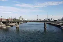 Au premier plan le pont aval vu depuis la rive droite de la Seine. | |||||