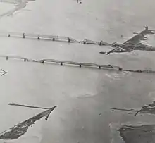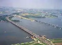Les ponts de Moerdijk vu depuis le ciel. Le pont routier est à droite, les ponts ferroviaires, à gauche. | |||