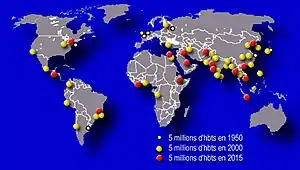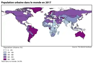 L'Organisation des Nations unies estime en 1950 la population urbaine à 30 % de la population mondiale soit 746 millions d'habitants. En 2008, pour la première fois de l'histoire connue, plus de la moitié des humains résident en ville[1]. En 2014, environ 54 % de la population mondiale vit en milieu urbain avec 3,9 milliards de citadins[2].