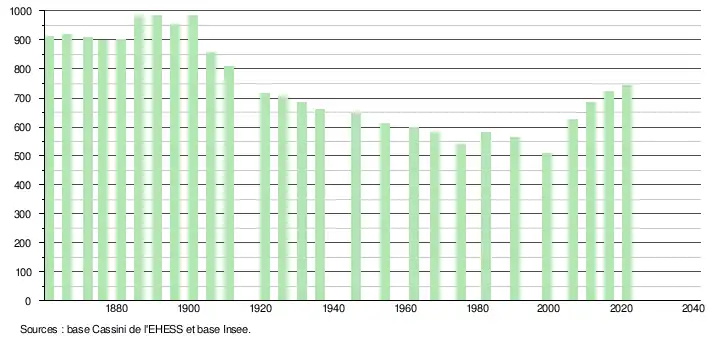L'évolution du nombre d'habitants est connue à travers les recensements de la population effectués dans la commune depuis 1861. Pour les communes de moins de 10 000 habitants, une enquête de recensement portant sur toute la population est réalisée tous les cinq ans, les populations légales des années intermédiaires étant quant à elles estimées par interpolation ou extrapolation[29]. Pour la commune, le premier recensement exhaustif entrant dans le cadre du nouveau dispositif a été réalisé en 2006[30].