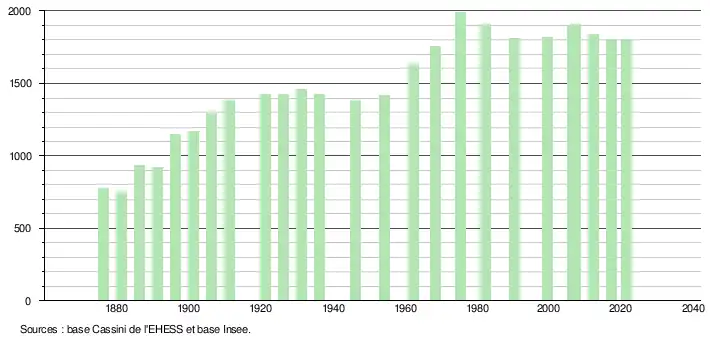 L'évolution du nombre d'habitants est connue à travers les recensements de la population effectués dans la commune depuis 1876. Pour les communes de moins de 10 000 habitants, une enquête de recensement portant sur toute la population est réalisée tous les cinq ans, les populations légales des années intermédiaires étant quant à elles estimées par interpolation ou extrapolation[19]. Pour la commune, le premier recensement exhaustif entrant dans le cadre du nouveau dispositif a été réalisé en 2007[20].
