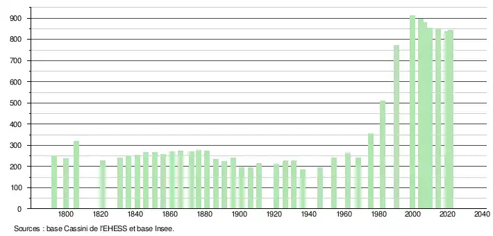 L'évolution du nombre d'habitants est connue à travers les recensements de la population effectués dans la commune depuis 1793. Pour les communes de moins de 10 000 habitants, une enquête de recensement portant sur toute la population est réalisée tous les cinq ans, les populations légales des années intermédiaires étant quant à elles estimées par interpolation ou extrapolation[20]. Pour la commune, le premier recensement exhaustif entrant dans le cadre du nouveau dispositif a été réalisé en 2004[21].