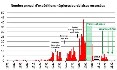 Dans un premier temps le commerce s'effectue avec les colonies des Amériques, et en particulier des Antilles et de Louisiane. Les négociants bordelais prennent alors une part importante dans la traite négrière, même si Bordeaux n'est que le troisième port français en nombre d'expéditions. Il est toutefois le port français qui profite le plus de l'esclavage grâce au commerce en droiture des denrées produites par les captifs dans les colonies[19].