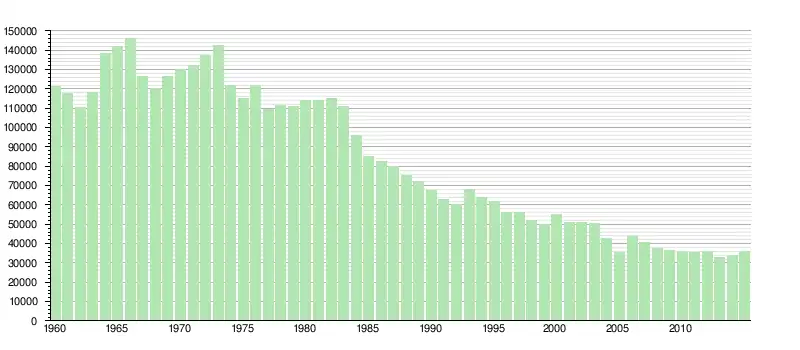 Quantité de poissons pêchée au port de Boulogne-sur-Mer (en tonnes)[31],[32],[28],[33],[34],[29],[35],[36],[30]