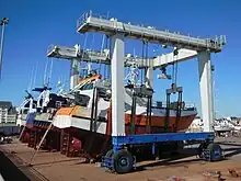 L'élévateur automoteur est en service sur le terre-plein de Garlahy. Il possède quatre roues jumelées dont deux motrices à l'arrière, un moteur hydraulique, et affiche une puissance de levage de 260 tonnes. Grâce à un système de sangles qui ceinture la coque du bateau, l'élévateur positionné au-dessus de la darse effectue des remontées ou mises à l'eau des bateaux et assure le transport sur l'aire de carénage, mise à terre et l'attinage. Sa mise en action nécessite un conducteur dans la cabine de pilotage et un agent à terre pour guider la manœuvre, qui dure de 1 heure à 1h30[4].
