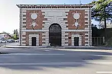 Le plan est carré, articulé sur le grand hall d'entrée central voûté, dans lequel débouche l'allée ; il y a une passerelle latérale et le compartiment pour le poste de garde, tandis que d'autres pièces pour l'abri du garde sont situées au deuxième étage. La porte était équipée de ponts-levis en bois, qui descendaient sur le pont en maçonnerie qui franchissait les douves[2].