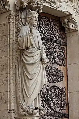 Les apôtres de gauche sont, en partant de l'extérieur, Barthélemy (par Geoffroy-Dechaume), Simon (par Fromanger), Jacques le Mineur (par Raymond Mirande), André (par Ferdinand Taluet), Jean (par Louis-Eugène Bion), Pierre (par Louis-Joseph Daumas). Ceux de droite, en partant de l'extérieur, sont Matthieu (par Jules Cavelier), Judas (par Théophile Caudron), Philippe (par Geoffroy-Dechaume ), Thomas (par Prinssay), Jacques le Majeur (par Jean-Louis Chenillon) et Paul de Tarse (par Fromanger). Chaque statue est surmontée d'un baldaquin gothique, tandis que le long de la corniche se trouvent à leurs pieds les symboles des Évangélistes en ronde-bosse[23].