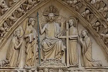 Aux deux extrémités (selon un modèle qui sera adopté plus tard dans d’autres cathédrales, comme celles de Poitiers et de Bordeaux, ainsi que dans les églises de Saint-Éliphe à Rampillon et de Saint-Sulpice à Saint-Sulpice-de-Favières) sont représentés à genoux Jean l'évangéliste (à gauche) et la Sainte Vierge ( à droite) [16]. La présence de cette dernière met en évidence la continuité thématique entre les décorations des trois portails de la façade occidentale, qui commence dans celui de droite avec l'enfance de Marie et de Jésus), continue dans celui de gauche avec la mort et l'Assomption de la Vierge et se termine dans le portail central avec l'intercession de Marie auprès du Fils[17]. La scène est encadrée par la cour céleste qui orne les voussures de l'archivolte selon une hiérarchie précise : dans les deux voussures les plus intérieures, se trouvent quarante-cinq anges qui applaudissent et chantent la gloire de Dieu. Puis vers l'extérieur, quatorze Patriarches et Prophètes, seize docteurs de l'Église, dix-huit Martyrs et dix-huit Vierges[18]. Les statues du Christ juge et de l'Ange avec les clous et la lance de Longin sont postérieures à tout le reste de la décoration du portail, remontant à 1240. Dans le cadre des restaurations du XIXe siècle, Viollet-le-Duc a trouvé sous le parvis, près du portail central, les restes d'un bas-relief représentant le Christ en gloire avec les symboles des évangélistes, probablement celui qui était présent dans la lunette à l'origine, et qui est supposé lui être antérieur, provenant du portail de la façade nord de la cathédrale et datant de 1180 environ[19].