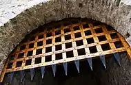 - La porte de garage : type de porte coulissante sectionnelle, mais qui glisse dans des rails verticaux (encadrement) et horizontaux (au plafond) reliés par une courte section courbe. Nécessairement constituée de plusieurs panneaux, reliés par les pentures, dont l'articulation permet aux panneaux de suivre la trajectoire imposée par les rails. Le glissement se fait par des roulettes, se déplaçant dans la gorge du rail. Ouverte, la porte est entièrement escamotée le long du plafond. Un système de ressorts aide l'utilisateur à soulever le poids de la porte pour l'ouvrir, mais ces portes sont très souvent motorisées.