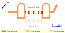 Au début des années 2010, l'existence d'un autre corps de bâtiment, côté ville, est démontrée, contrairement aux propositions de Paul-Marie Duval en 1954[6]. Il est relié au reste du dispositif par deux murs longeant la voie, mais il disparaît très précocement. L'édifice a donc l'aspect d'une double porte avec une cour intérieure, fonctionnant comme une sorte de sas comparable à ce qui existe par exemple à la Porte d'Auguste à Nîmes[8].