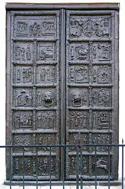 Selon Louis Réau, le style de ces portes fait penser à une réalisation de l'art roman germanique. Les ateliers de Saxe étaient les seuls qui pouvaient rivaliser avec Constantinople et qui bien avant la fonderie des Vischer de Nurenberg exportaient leurs œuvres jusqu'en Italie du nord et dans l'Orient Slave. Les portes de Bernward de la cathédrale de Hildesheim, datant de 1015, sont une réalisation qui provient de Basse-Saxe; de même la colonne en bronze de l'évêque Bernward de Hildesheim qui servait de support à un cierge pascal et dont les bas-reliefs en spirale imitent la Colonne de Trajan[5]; et encore les portes en bronze de la Basilique San Zeno de Vérone.