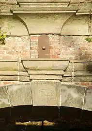 La partie centrale de la façade abrite une haute porte cintrée à encadrement de pierre bleue, impostes et clé d'arc saillante[6] portant le millésime de 1725.