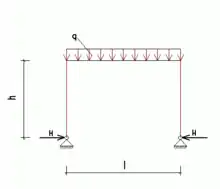 Dans le cas standard, un portique a une élévation quadrilatère et est constitué de deux barres de portique verticales ( poteaux ) et d'une barre horizontale. Les barres peuvent être encastrées en pied (photo du haut) ou montées de manière articulée (simplement un portique à deux articulations statiquement indéterminé ). Selon la conception, les coins du portique peuvent être supposés rigides, flexibles ou articulés. Plusieurs portiques peuvent être assemblés pour former une structure plus complexe, similaire à un système réticulé . Avec une structure de plancher (portique au sol), plusieurs portiques uniformes sont superposés.