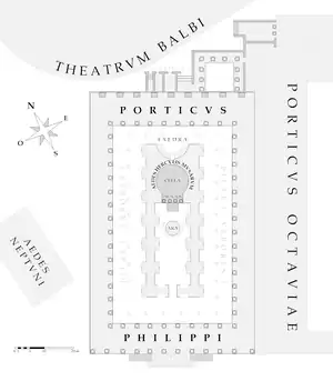 Le monument tel qu'il a été reconstruit par Philippus est décrit comme somptueux et est surtout réputé pour le portique qui l'entoure et qui sert de galerie d'exposition d’œuvres d'art[18]. Ce portique s'élève sur une plate-forme de 3 mètres de hauteur par rapport au niveau du sol des environs, ceci afin de protéger le monument des inondations fréquentes dans cette zone[31]. Le mur méridional du portique est construit dans la continuité de celui du portique d'Octavie. L'édifice tel qu'il est après la restauration entreprise sous Domitien après avoir été endommagé lors de l'incendie de 80 sous Titus est en partie représenté sur un fragment de la Forma Urbis [18]. Cette représentation a donné lieu à plusieurs interprétations[15]. Selon une première hypothèse, il s'agit d'un portique double. En effet, la cour intérieure semble entourée d'une série d'arcades supportées par des piliers représentés comme des colonnes par des points sur le plan de marbre[32],[33]. Selon une deuxième hypothèse, les points représentés sur le plan ne sont pas des colonnes ou des piliers mais des arbres. Dans ce cas, le portique ne se compose que d'une colonnade[34].
