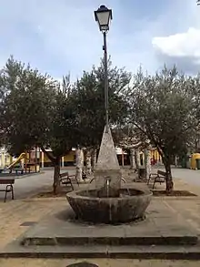 Vue sur le Plaza, l'église et la fontaine. | ||||