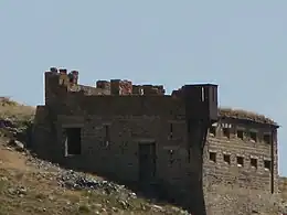 - Le blockhaus du Mont des Fourches qui domine tous les environs avec son échauguette en tôle d'acier dont les éléments sont boulonnés afin de pouvoir être transportés à dos de mulet[3]. Construit à partir de 1898 et remanié en 1903-1905[4] il est plus imposant que les deux autres blockhaus de la position. On trouve à l'intérieur une chambrée pour cinquante hommes en deux travées de lits de camps superposés ainsi que, légèrement surélevées, une cuisine et la chambre d'officier. Au-dessus de l'ensemble, un toit en terrasse servait de plate-forme de tir pour les fantassins et desservait aussi l'échauguette situé en encorbellement dans l'angle nord-ouest ; les murs crénelés qui entouraient le toit-terrasse ont aujourd'hui disparu. On accédait à cette terrasse par des échelons de barreaux métalliques fixés contre le mur d'une tour carrée située dans l'angle sud-est, à côté de la chambre de l'officier, et qui assurait le flanquement de deux côtés du blockhaus. La façade ouest était percée de créneaux de tir verticaux, l'accès s'effectuant depuis deux portes donnant sur la chambrée. La façade ouest avait quant à elle deux niveaux superposés de créneaux horizontaux.