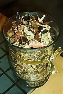 Il est constitué de pétales, de feuilles séchées et d'épices et placées dans un pot après avoir ajouté un fixateur. Ce mélange est laissé à mûrir dans le pot bien fermé environ un mois.