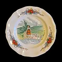 Fondée par le duc Léopold de Lorraine, Lunéville fabrique de la faïence à partir de 1723[44]. Géographiquement très proche, la manufacture de Saint-Clément débute sa production en 1758. Elle est d’abord associée à Lunéville et leurs décors sont souvent semblables. Les productions lorraines les plus anciennes que l'on trouve en Alsace ne portent ni talon, ni marque[45], lesquels n’apparaîtront que vers 1820[46]. Les pièces recherchées sont essentiellement des pichets, des soupières et surtout des assiettes plates, aux ailes peignées de rouge pourpre. Alors peints à la main, les motifs sont des fleurs et des oiseaux. les décors seront très vite appliqués au pochoir et ensuite grâce à des décalcomanies.