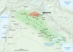La poterie de Hassuna s'est développée dans le nord de l'Irak actuel. Le site archéologique de Hassuna se situe au sud de l'aire d'expansion de cette poterie comprenant entre autres Ninive et Yarim Tepe I. Elle apparait à la même période (s'étalant sur une période d'un millénaire) que les poteries d'Amuq B, de Samarra et du Susiane Archaïque 1 et 2.