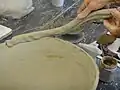 La technique peut être affinée en utilisant une planchette et un galet pour modeler la forme de la pièce. Le galet est positionné au contact de la terre à l'intérieur de la pièce. La planchette utilisée comme battoir à l'extérieur permet de comprimer la paroi de la poterie. Cette opération permet à la fois de réduire l'épaisseur de la pièce et d'en renforcer la cohésion.