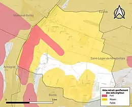 Les mouvements de terrains susceptibles de se produire sur la commune sont des affaissements et effondrements liés aux cavités souterraines (hors mines) et des tassements différentiels[17]. Afin de mieux appréhender le risque d’affaissement de terrain, un inventaire national permet de localiser les éventuelles cavités souterraines sur la commune[18]. Le retrait-gonflement des sols argileux est susceptible d'engendrer des dommages importants aux bâtiments en cas d’alternance de périodes de sécheresse et de pluie[19]. 80,8 % de la superficie communale est en aléa moyen ou fort (79,5 % au niveau départemental et 48,5 % au niveau national)[Carte 2]. Depuis le , en application de la loi ÉLAN, différentes contraintes s'imposent aux vendeurs, maîtres d'ouvrages ou constructeurs de biens situés dans une zone classée en aléa moyen ou fort[Note 2],[20].