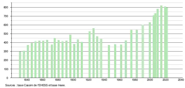 L'évolution du nombre d'habitants est connue à travers les recensements de la population effectués dans la commune depuis 1831. Pour les communes de moins de 10 000 habitants, une enquête de recensement portant sur toute la population est réalisée tous les cinq ans, les populations légales des années intermédiaires étant quant à elles estimées par interpolation ou extrapolation[36]. Pour la commune, le premier recensement exhaustif entrant dans le cadre du nouveau dispositif a été réalisé en 2004[37].