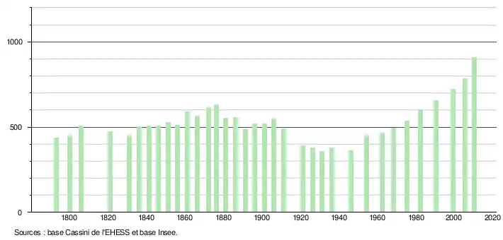 L'évolution du nombre d'habitants est connue à travers les recensements de la population effectués dans la commune depuis 1793. À partir du , les populations légales des communes sont publiées annuellement dans le cadre d'un recensement qui repose désormais sur une collecte d'information annuelle, concernant successivement tous les territoires communaux au cours d'une période de cinq ans. Pour les communes de moins de 10 000 habitants, une enquête de recensement portant sur toute la population est réalisée tous les cinq ans, les populations légales des années intermédiaires étant quant à elles estimées par interpolation ou extrapolation[4]. Pour la commune, le premier recensement exhaustif entrant dans le cadre du nouveau dispositif a été réalisé en 2005[5],[Note 1].