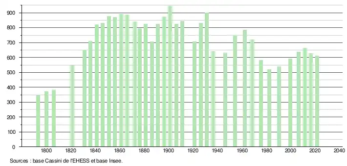 L'évolution du nombre d'habitants est connue à travers les recensements de la population effectués dans la commune depuis 1793. Pour les communes de moins de 10 000 habitants, une enquête de recensement portant sur toute la population est réalisée tous les cinq ans, les populations légales des années intermédiaires étant quant à elles estimées par interpolation ou extrapolation[13]. Pour la commune, le premier recensement exhaustif entrant dans le cadre du nouveau dispositif a été réalisé en 2006[14].