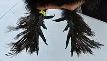 | Doigts | Au nombre de 5. Les 4e et 5e doigts bien séparés au niveau de l’implantation. Le 5e doigt légèrement dirigé vers le haut. Noirs ou bleu foncé. Couleur plus claire acceptée pour certains coloris (voir ci-après). | Absence de 5e doigt ou mauvaise implantation des 4e et 5e doigts. Doigts ou ongles surnuméraires. Couleur trop claire (rosée) ou non uniforme (taches), sauf exception (voir ci-après). |