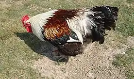 Mêmes caractéristiques que le coq en tenant compte des différences sexuelles. Queue portée semi-ouverte. Crête droite. Une légère frisure au camail n’est pas à considérer comme un défaut grave.