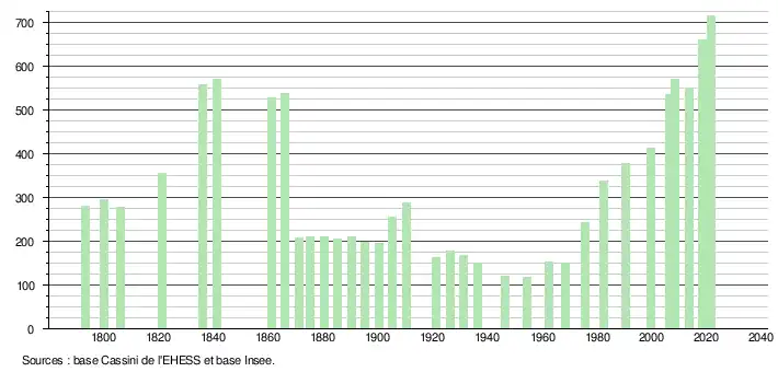 L'évolution du nombre d'habitants est connue à travers les recensements de la population effectués dans la commune depuis 1793. Pour les communes de moins de 10 000 habitants, une enquête de recensement portant sur toute la population est réalisée tous les cinq ans, les populations légales des années intermédiaires étant quant à elles estimées par interpolation ou extrapolation[21]. Pour la commune, le premier recensement exhaustif entrant dans le cadre du nouveau dispositif a été réalisé en 2008[22].