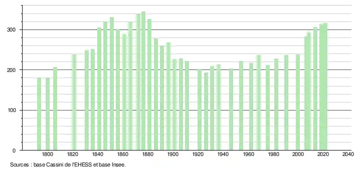 L'évolution du nombre d'habitants est connue à travers les recensements de la population effectués dans la commune depuis 1793. Pour les communes de moins de 10 000 habitants, une enquête de recensement portant sur toute la population est réalisée tous les cinq ans, les populations légales des années intermédiaires étant quant à elles estimées par interpolation ou extrapolation[17]. Pour la commune, le premier recensement exhaustif entrant dans le cadre du nouveau dispositif a été réalisé en 2008[18].