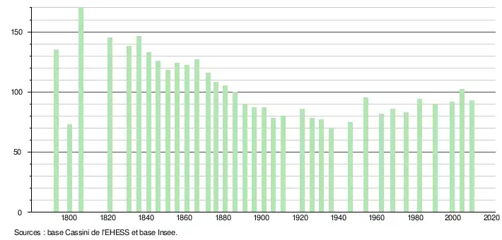 L'évolution du nombre d'habitants est connue à travers les recensements de la population effectués dans la commune depuis 1793. À partir du , les populations légales des communes sont publiées annuellement dans le cadre d'un recensement qui repose désormais sur une collecte d'information annuelle, concernant successivement tous les territoires communaux au cours d'une période de cinq ans. Pour les communes de moins de 10 000 habitants, une enquête de recensement portant sur toute la population est réalisée tous les cinq ans, les populations légales des années intermédiaires étant quant à elles estimées par interpolation ou extrapolation[6]. Pour la commune, le premier recensement exhaustif entrant dans le cadre du nouveau dispositif a été réalisé en 2004[7],[Note 2].