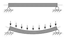 - la flexion, lorsque les plans de deux sections transversales ne font plus entre eux le même angle qu'auparavant l'intersection de ces deux plans étant restée parallèle à elle-même ;