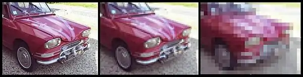 L'image ci-dessous fait apparaître un même sujet avec trois résolutions différentes. À partir d'une certaine distance, l'œil ne fait plus la différence. Il est alors possible de déterminer la résolution d'un ou des deux yeux : il s'agit du rapport entre la taille des gros pixels (image de droite) et la distance à partir de laquelle on ne perçoit plus de différence entre les images.