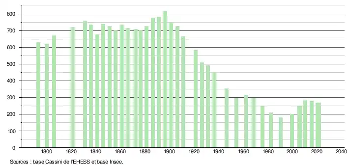 L'évolution du nombre d'habitants est connue à travers les recensements de la population effectués dans la commune depuis 1793. Pour les communes de moins de 10 000 habitants, une enquête de recensement portant sur toute la population est réalisée tous les cinq ans, les populations légales des années intermédiaires étant quant à elles estimées par interpolation ou extrapolation[28]. Pour la commune, le premier recensement exhaustif entrant dans le cadre du nouveau dispositif a été réalisé en 2005[29].