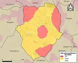 Le retrait-gonflement des sols argileux est susceptible d'engendrer des dommages importants aux bâtiments en cas d’alternance de périodes de sécheresse et de pluie. 99,6 % de la superficie communale est en aléa moyen ou fort (59,3 % au niveau départemental et 48,5 % au niveau national). Sur les 632 bâtiments dénombrés sur la commune en 2019, 632 sont en aléa moyen ou fort, soit 100 %, à comparer aux 85 % au niveau départemental et 54 % au niveau national. Une cartographie de l'exposition du territoire national au retrait gonflement des sols argileux est disponible sur le site du BRGM[28],[Carte 2].