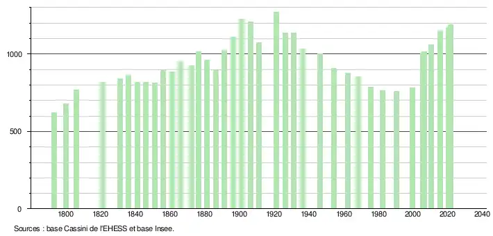 L'évolution du nombre d'habitants est connue à travers les recensements de la population effectués dans la commune depuis 1793. Pour les communes de moins de 10 000 habitants, une enquête de recensement portant sur toute la population est réalisée tous les cinq ans, les populations légales des années intermédiaires étant quant à elles estimées par interpolation ou extrapolation[34]. Pour la commune, le premier recensement exhaustif entrant dans le cadre du nouveau dispositif a été réalisé en 2005[35].