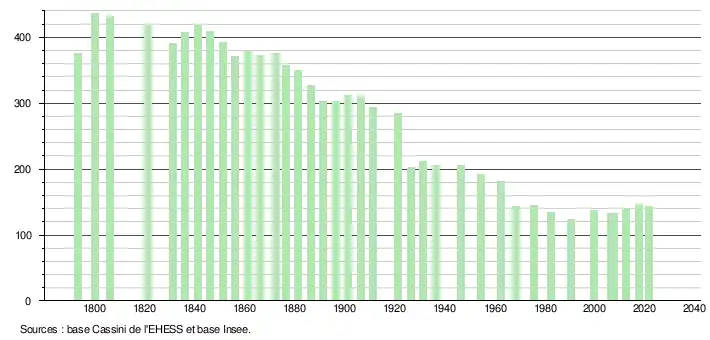 L'évolution du nombre d'habitants est connue à travers les recensements de la population effectués dans la commune depuis 1793. Pour les communes de moins de 10 000 habitants, une enquête de recensement portant sur toute la population est réalisée tous les cinq ans, les populations légales des années intermédiaires étant quant à elles estimées par interpolation ou extrapolation[21]. Pour la commune, le premier recensement exhaustif entrant dans le cadre du nouveau dispositif a été réalisé en 2007[22].