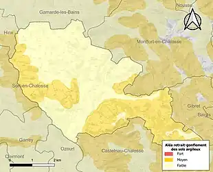 Le retrait-gonflement des sols argileux est susceptible d'engendrer des dommages importants aux bâtiments en cas d’alternance de périodes de sécheresse et de pluie. 42,4 % de la superficie communale est en aléa moyen ou fort (19,2 % au niveau départemental et 48,5 % au niveau national). Sur les 341 bâtiments dénombrés sur la commune en 2019, 109 sont en aléa moyen ou fort, soit 32 %, à comparer aux 17 % au niveau départemental et 54 % au niveau national. Une cartographie de l'exposition du territoire national au retrait gonflement des sols argileux est disponible sur le site du BRGM[20],[Carte 2].