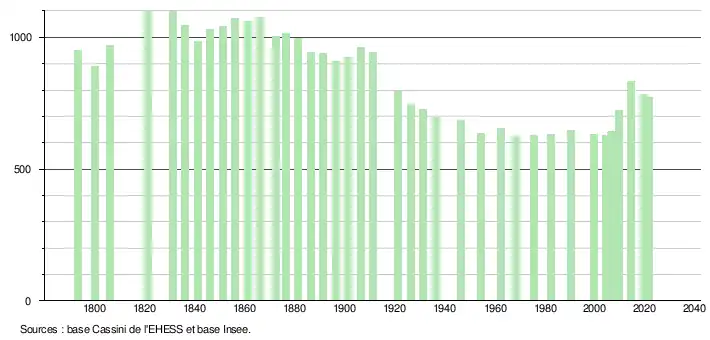 | L'évolution du nombre d'habitants est connue à travers les recensements de la population effectués dans la commune depuis 1793. Pour les communes de moins de 10 000 habitants, une enquête de recensement portant sur toute la population est réalisée tous les cinq ans, les populations légales des années intermédiaires étant quant à elles estimées par interpolation ou extrapolation[22]. Pour la commune, le premier recensement exhaustif entrant dans le cadre du nouveau dispositif a été réalisé en 2004[23]. En 2021, la commune comptait 773 habitants[Note 3], en diminution de 8,95 % par rapport à 2015 (Landes : +4,9 %, France hors Mayotte : +1,84 %). |