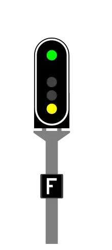 En signalisation lumineuse uniquement, le préavertissement était présenté sous forme d'un feu vert et d'un feu jaune, alignés verticalement.