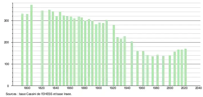 L'évolution du nombre d'habitants est connue à travers les recensements de la population effectués dans la commune depuis 1793. Pour les communes de moins de 10 000 habitants, une enquête de recensement portant sur toute la population est réalisée tous les cinq ans, les populations légales des années intermédiaires étant quant à elles estimées par interpolation ou extrapolation[18]. Pour la commune, le premier recensement exhaustif entrant dans le cadre du nouveau dispositif a été réalisé en 2006[19].
