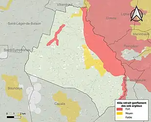 Le retrait-gonflement des sols argileux est susceptible d'engendrer des dommages importants aux bâtiments en cas d’alternance de périodes de sécheresse et de pluie. 23,9 % de la superficie communale est en aléa moyen ou fort (67,4 % au niveau départemental et 48,5 % au niveau national). Sur les 613 bâtiments dénombrés sur la commune en 2019, 340 sont en aléa moyen ou fort, soit 55 %, à comparer aux 84 % au niveau départemental et 54 % au niveau national. Une cartographie de l'exposition du territoire national au retrait gonflement des sols argileux est disponible sur le site du BRGM[29],[Carte 2].